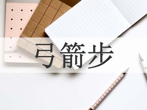 [Bow-and-Arrow Step] 是丁字步的一种变形和发展,它是将丁字步的前腿向旁伸出后弯曲,后腿绷直,即前腿弓,后腿直。弓的腿足尖向正旁,直的腿足尖向正前。弓的腿要求小腿和地面成垂直角度,大腿和小腿成稍大于90°的钝角,重心在两腿中间,上身直立,方向对正前,双肩要和腿在一平面上,头可看正前,也可看前侧